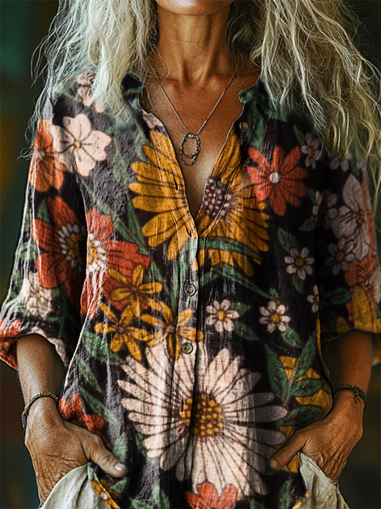Women's Bohemian Floral Art Print Casual Cotton Linen Shirt