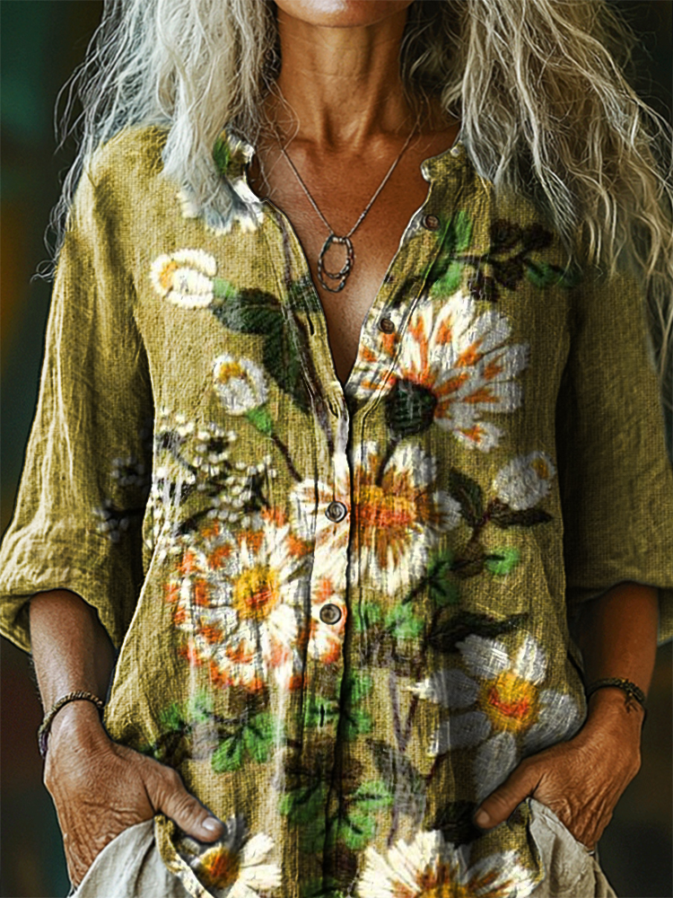 Women's Bohemian Floral Art Print Casual Cotton Linen Shirt