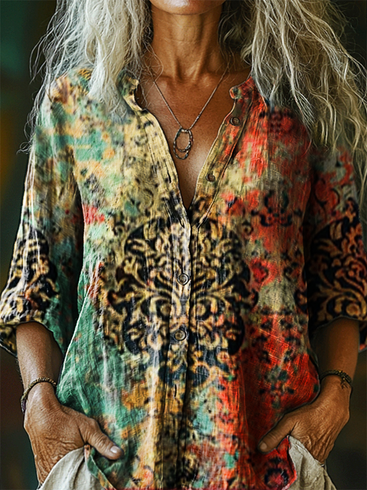 Women's Bohemian Floral Art Print Casual Cotton Linen Shirt