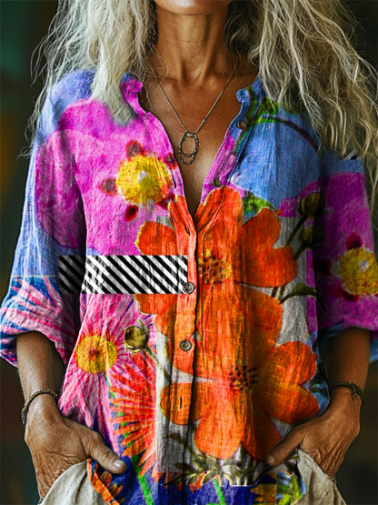 Women's Bohemian Floral Art Print Casual Cotton Linen Shirt