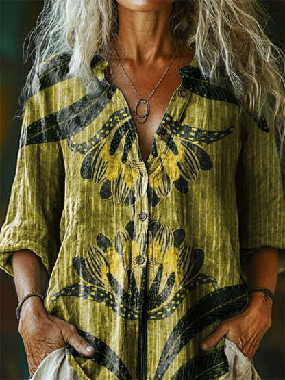 Women's Bohemian Floral Art Print Casual Cotton Linen Shirt