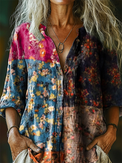 Women's Bohemian Floral Art Print Casual Cotton Linen Shirt