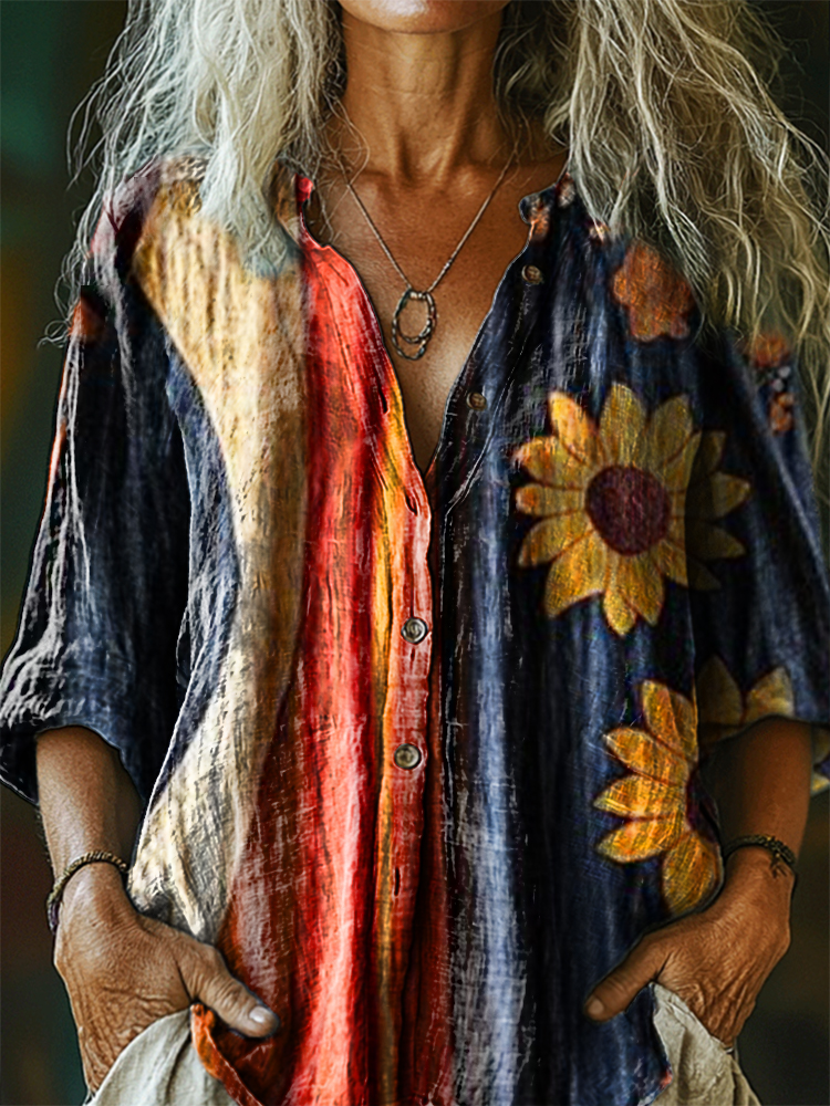Women's Bohemian Floral Art Print Casual Cotton Linen Shirt