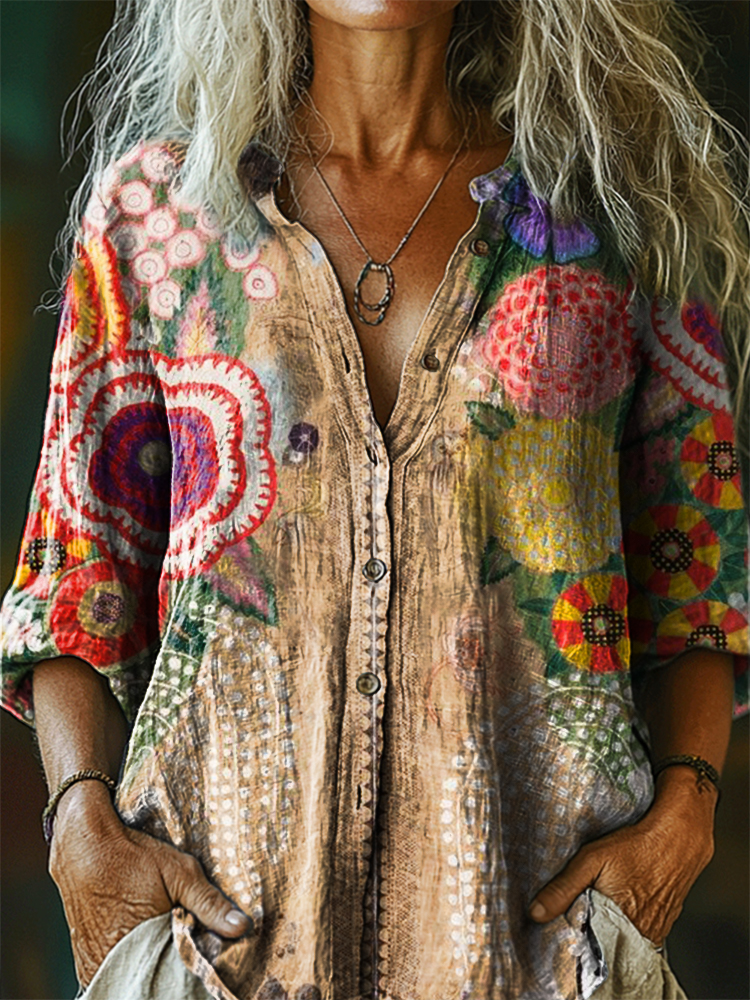 Women's Bohemian Floral Art Print Casual Cotton Linen Shirt
