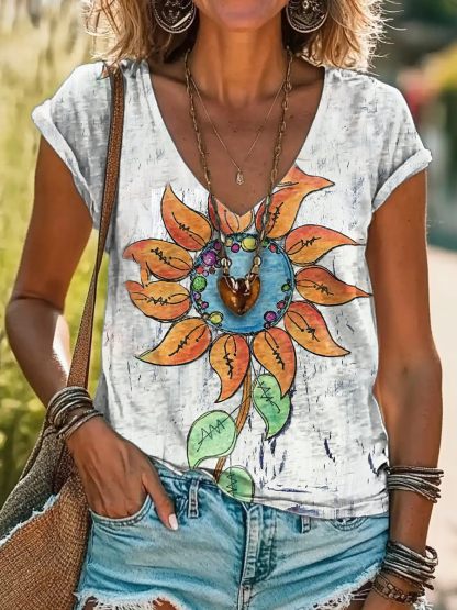 Women's Bohemian Floral Art Print Casual Cotton Linen Shirt