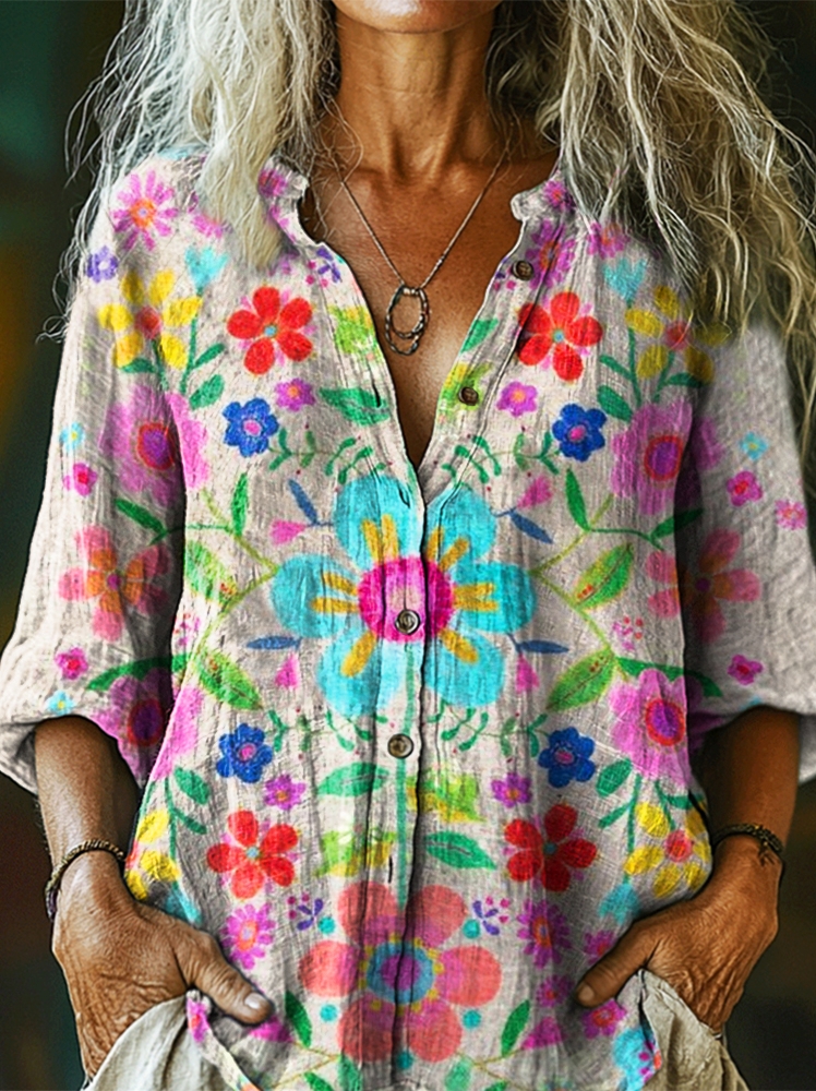 Women's Bohemian Floral Art Print Casual Cotton Pocket Shirt