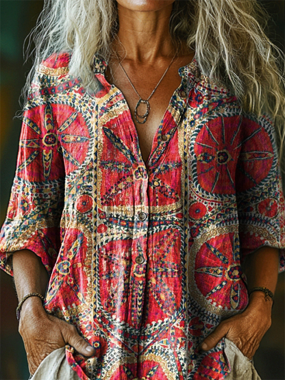 Women's Bohemian Floral Collage Art Print Casual Cotton Linen Shirt