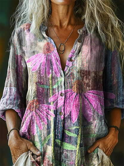 Women's Bohemian Floral Collage Art Print Casual Cotton Linen Shirt