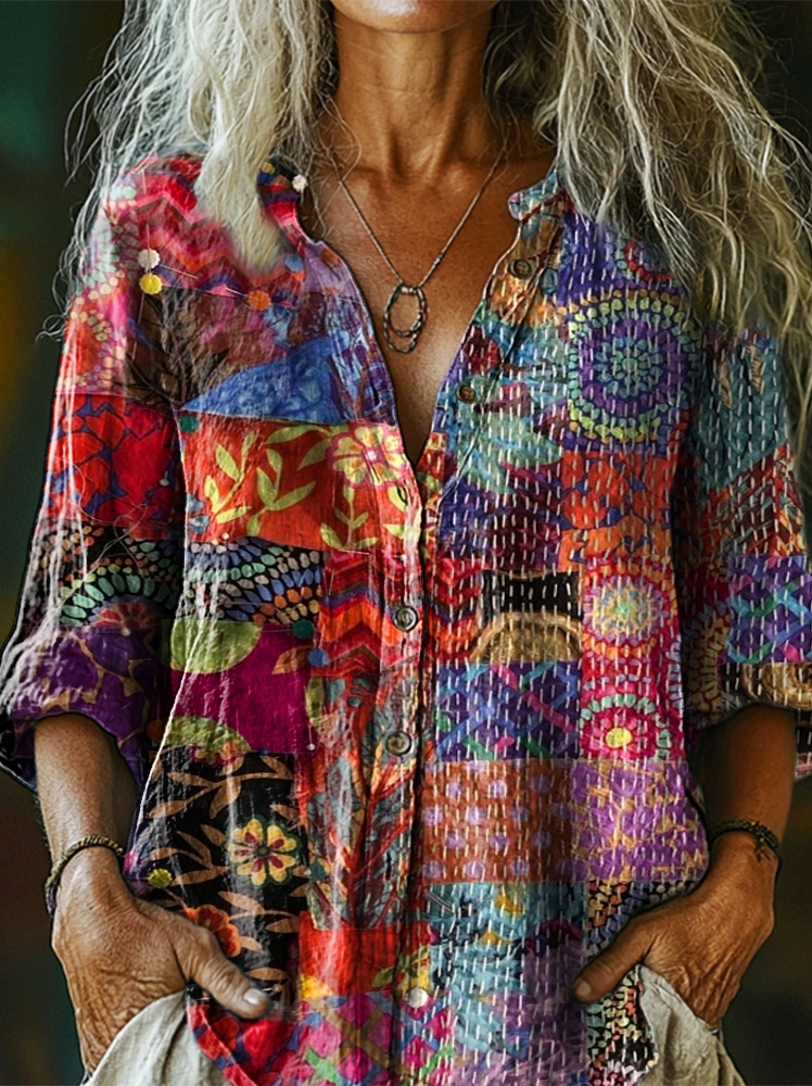 Women's Bohemian Floral Collage Pattern Print Casual Cotton Linen Shirt
