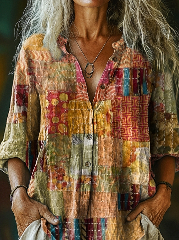 Women's Bohemian Floral Collage Pattern Print Casual Cotton Linen Shirt