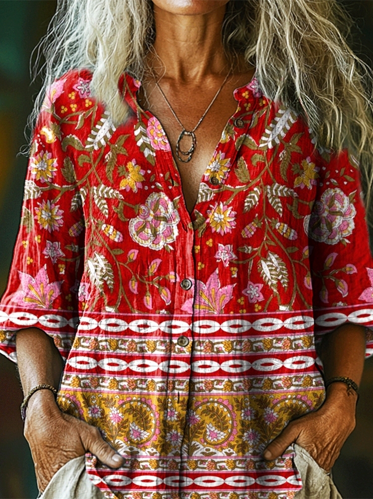 Women's Bohemian Floral Collage Print Casual Cotton Linen Shirt