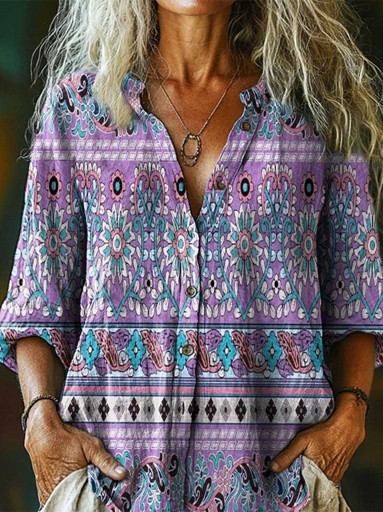 Women's Bohemian Floral Collage Print Casual Cotton Linen Shirt