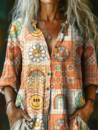 Women's Bohemian Hippie Patchwork Pattern Art Print Casual Cotton Linen Shirt