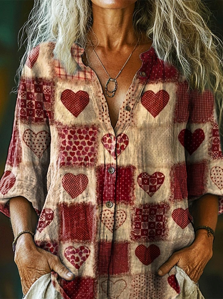 Women's Bohemian Patchwork Heart Print Casual Cotton Linen Shirt