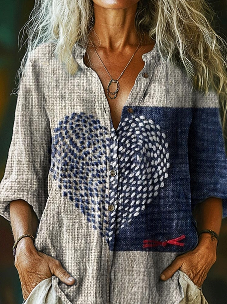 Women's Bohemian Patchwork Heart Print Casual Cotton Linen Shirt