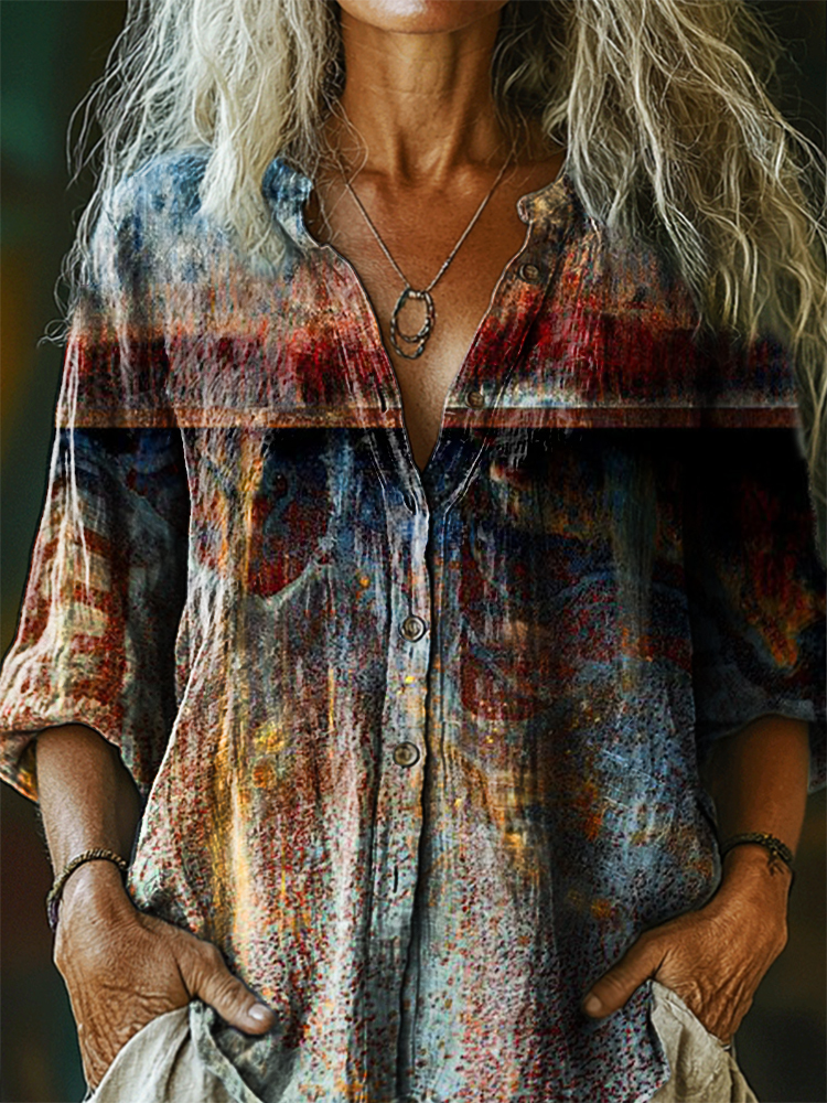 Women's Bohemian Pattern Art Print Casual Cotton Linen Shirt