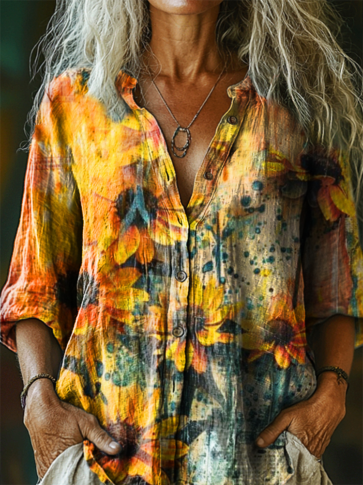 Women's Bohemian Sunfloral Art Print Casual Cotton Linen Shirt