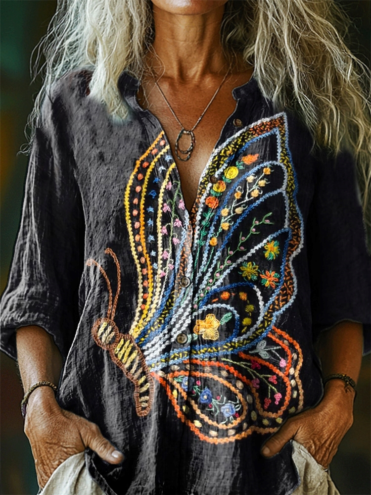 Women's Butterfly Pattern Art Print Casual Cotton Linen Shirt