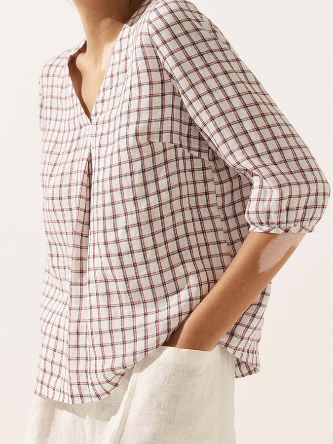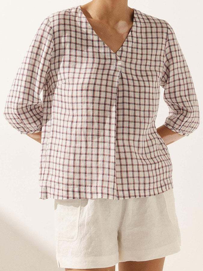 Women's Casual Checked Linen Classic Doll Collar Top