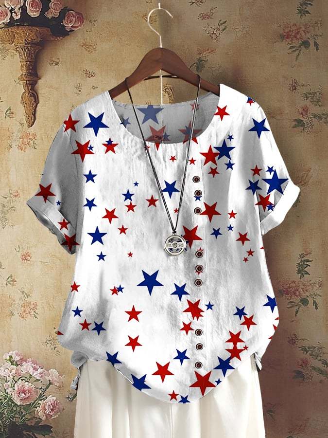 Women's Casual Cotton And Linen Independence Day Star Short-Sleeved Round Neck Shirt