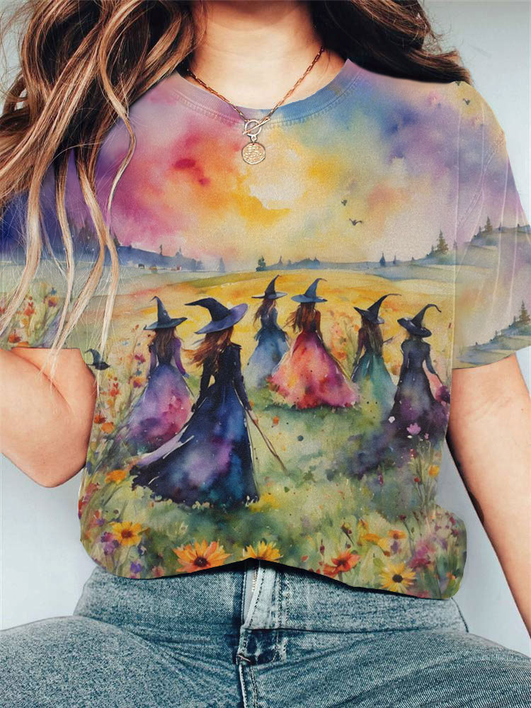 Women's Casual Halloween Watercolor Witch Print T-shirt
