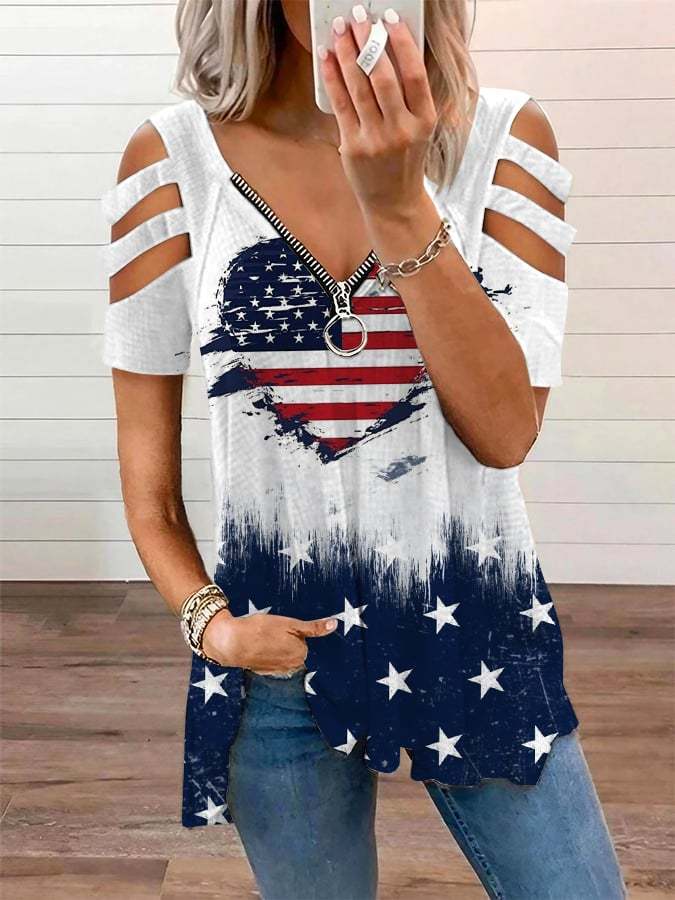 Women's Casual Independence Day Love Heart Zipper Hollow Top