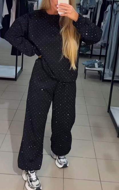Women's Casual Round Neck Diamond Hooded Two Piece Suit