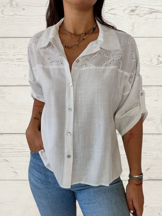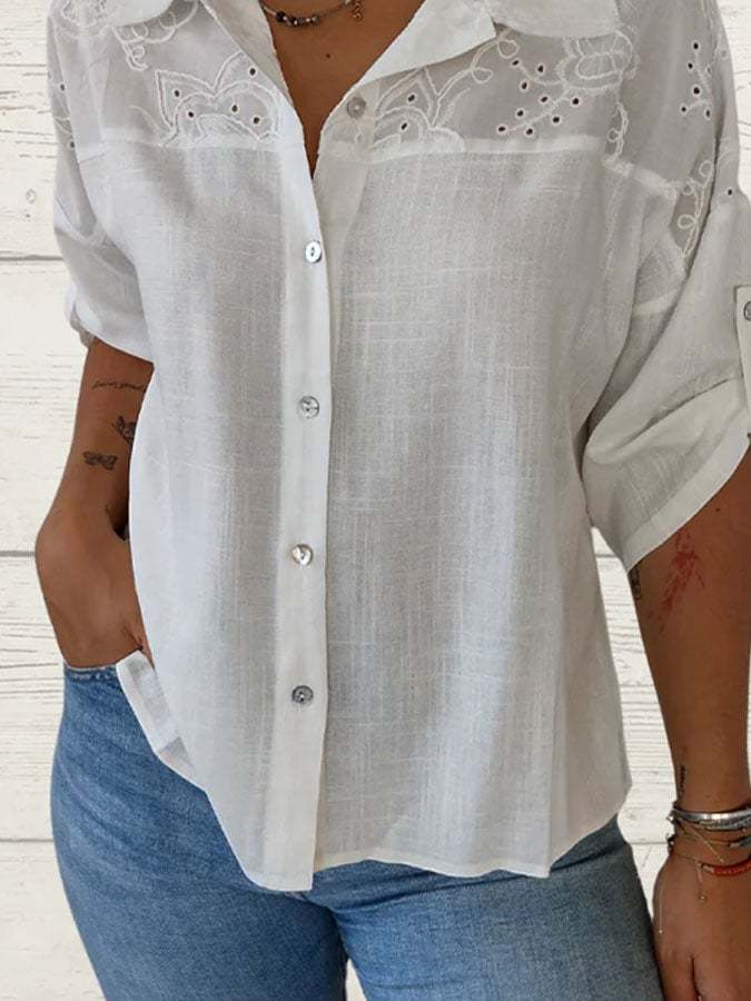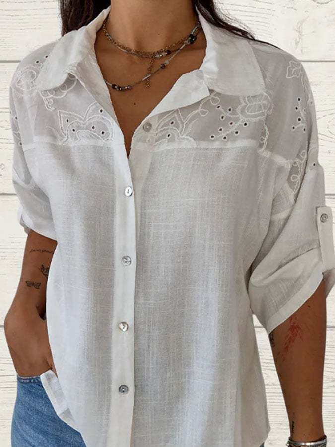 Women'S Casual Solid Color Lapel Stitching Lace Shirt