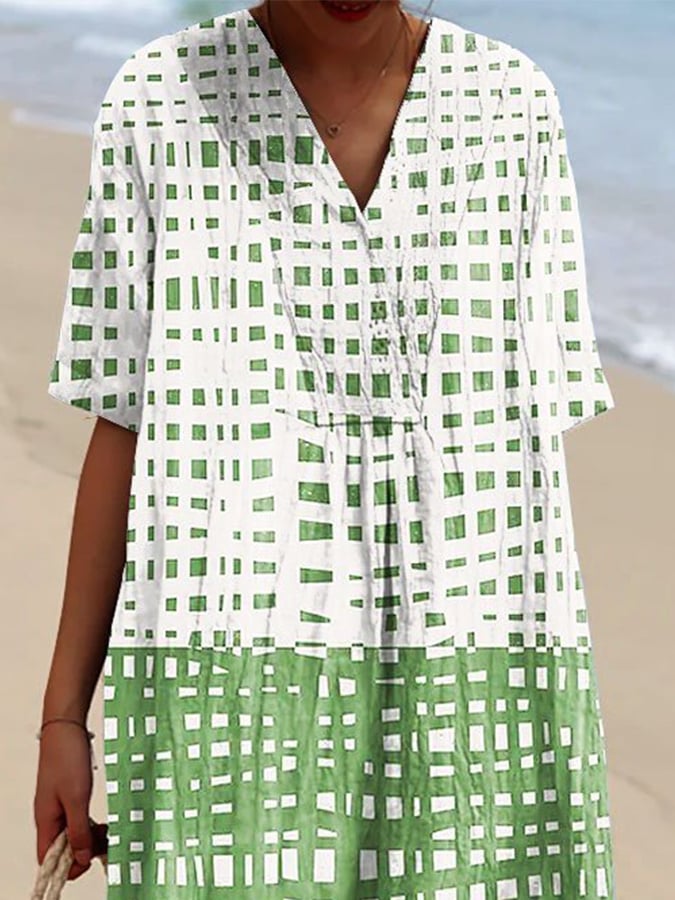 Women's Casual V-Neck Abstract Color Block Loose Dress