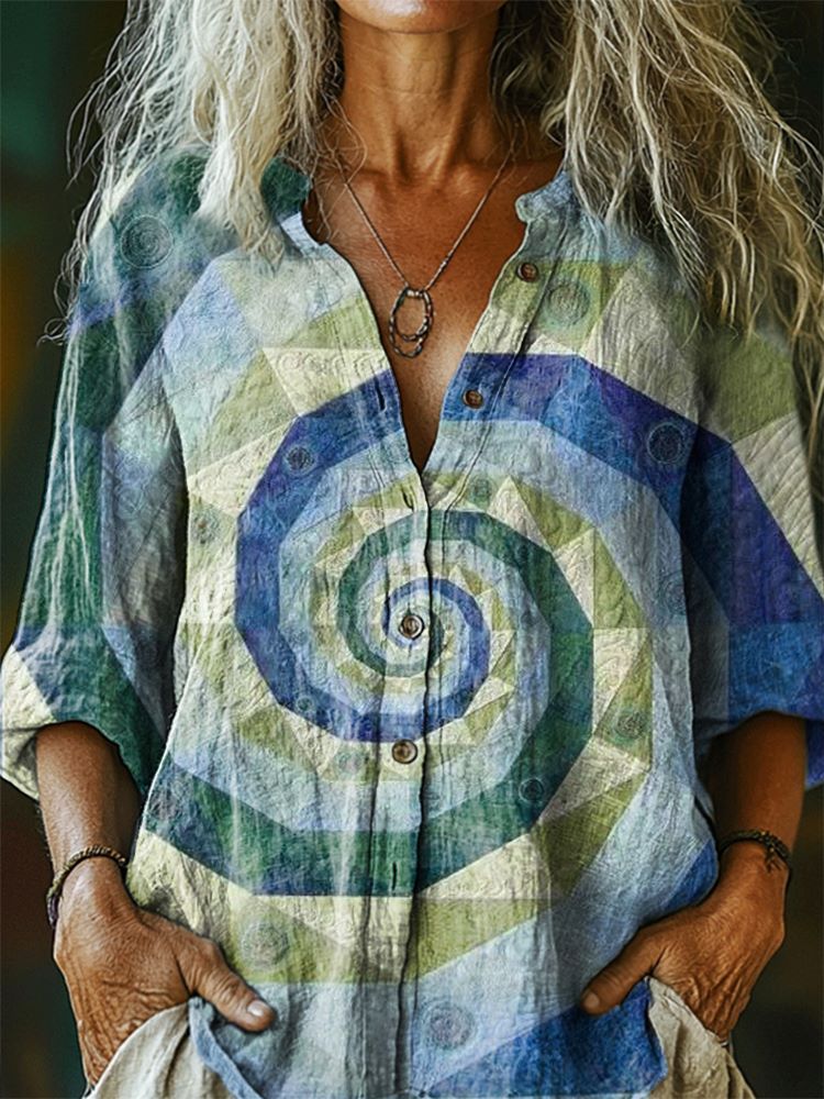 Women's Colorblocked Swirl Pattern Art Print Casual Cotton Linen Shirt