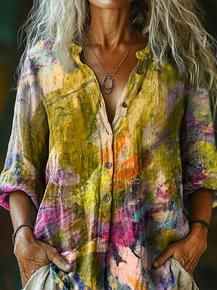 Women's Colorful Abstract Flower Art Print Casual Cotton Linen Shirt