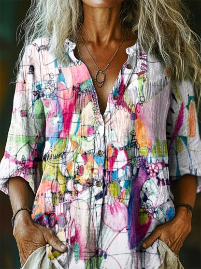 Women's Colorful Abstract Pattern Art Print Casual Cotton Linen Shirt