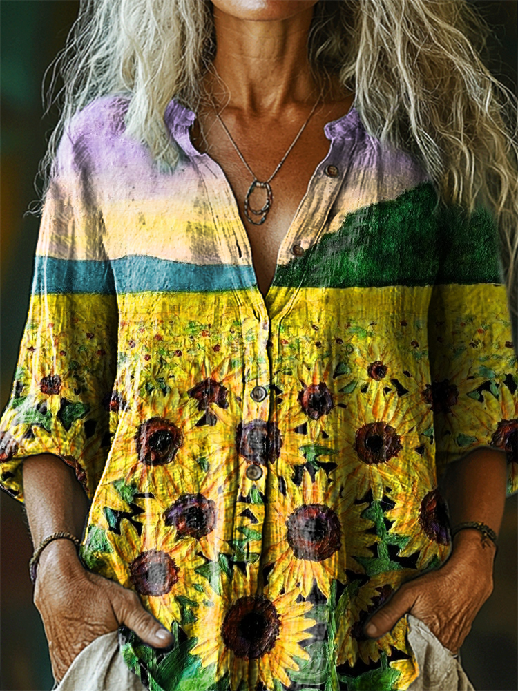 Women's Colorful Daisy Floral Art Print Casual Cotton Linen Shirt