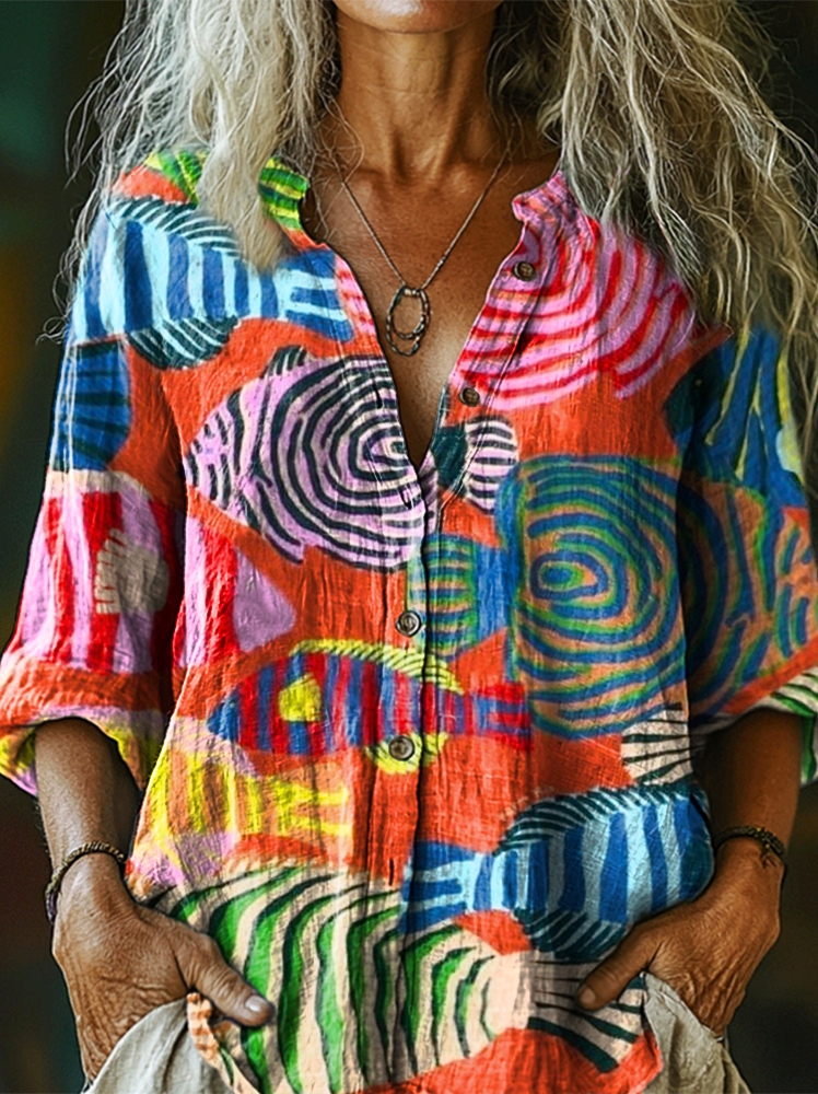 Women's Colorful Ethnic Fish Art Print Casual Cotton Linen Shirt