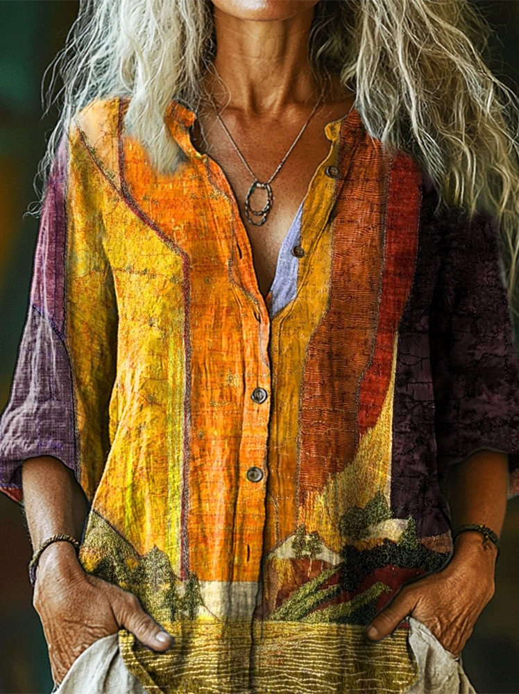 Women's Colorful Ethnic Landscape Art Print Casual Cotton Linen Shirt