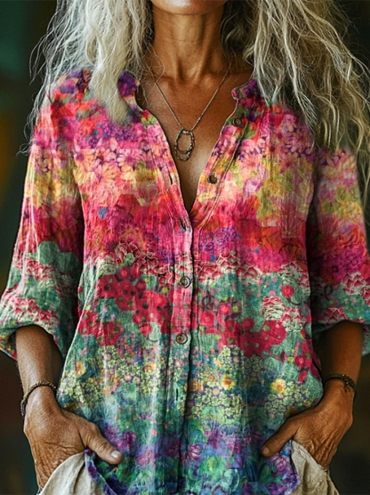 Women's Colorful Floral Art Print Casual Cotton Linen Shirt