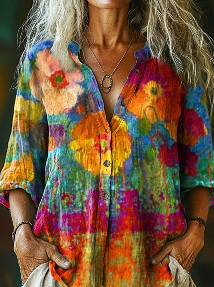 Women's Colorful Floral Art Print Casual Cotton Pocket Shirt