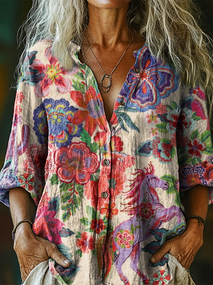 Women's Colorful Folk Flower Art Print Casual Cotton Linen Shirt