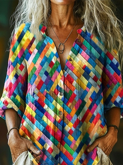 Women's Colorful Geometric Collage Art Print Casual Cotton Linen Shirt