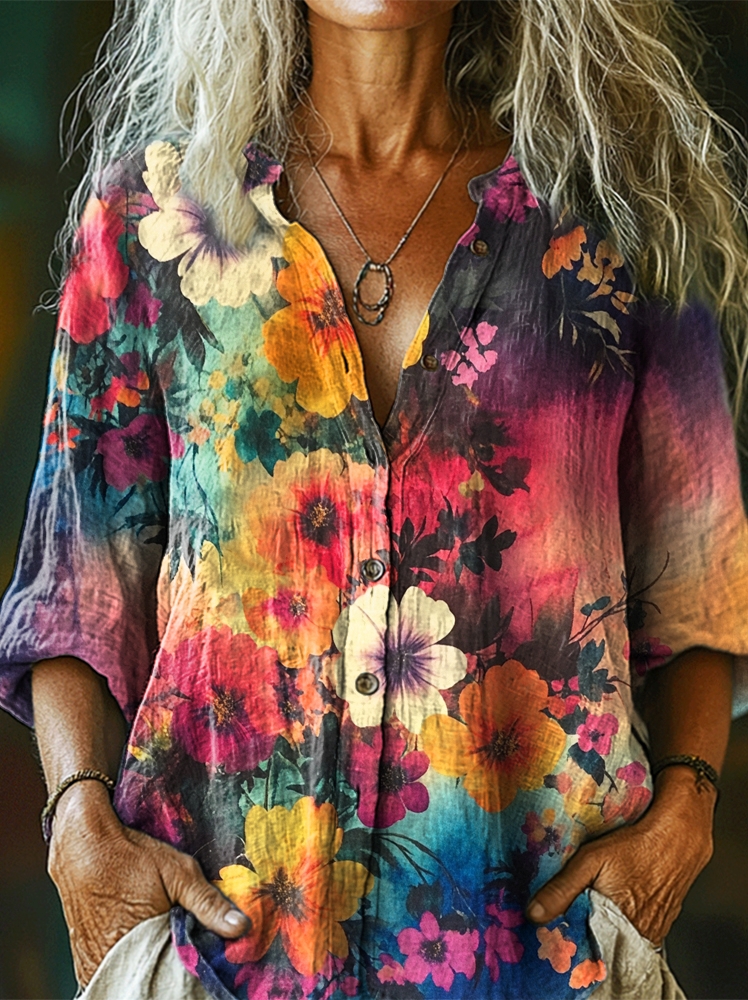 Women's Colorful Gradient Floral Print Casual Cotton Linen Shirt
