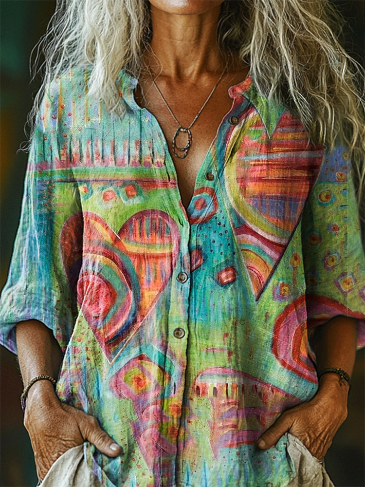 Women's Colorful Heart Pattern Art Print Casual Cotton Linen Shirt