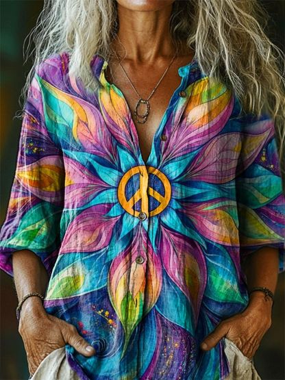 Women's Colorful Hippie Floral Pattern Art Print Casual Cotton Linen Shirt
