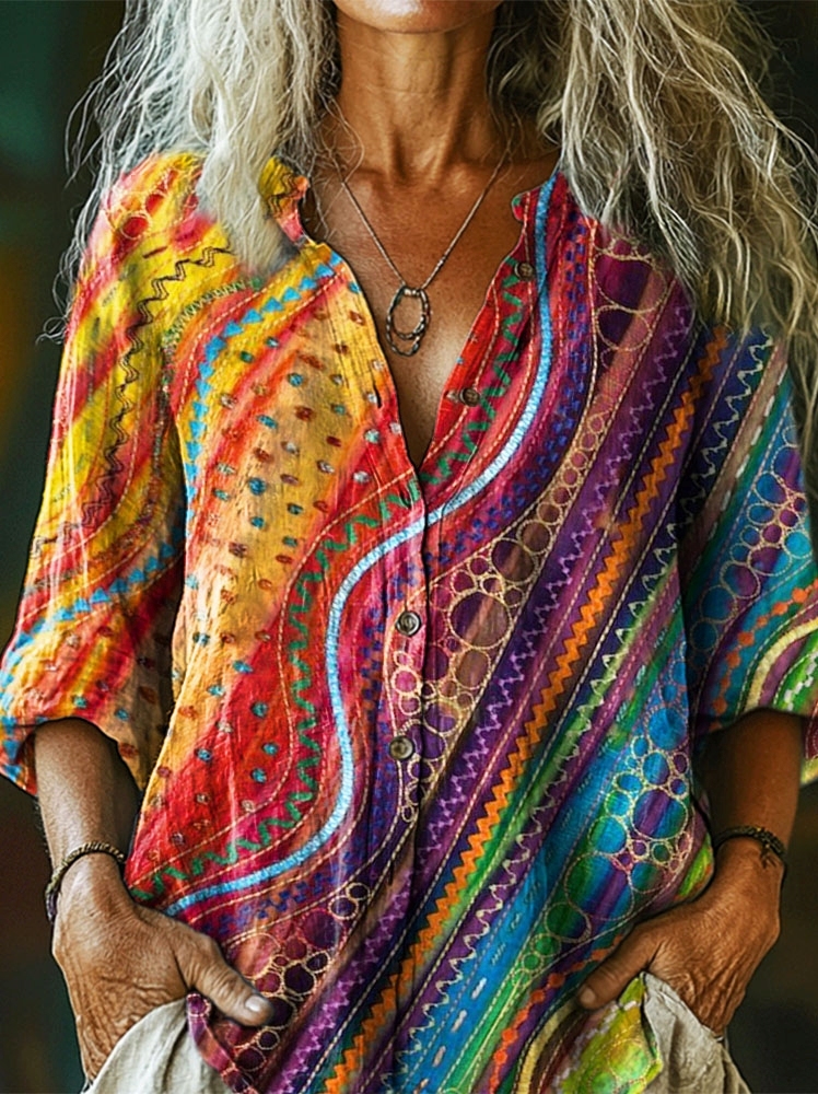 Women's Colorful Lines Abstract Art Pattern Print Casual Cotton Linen Shirt