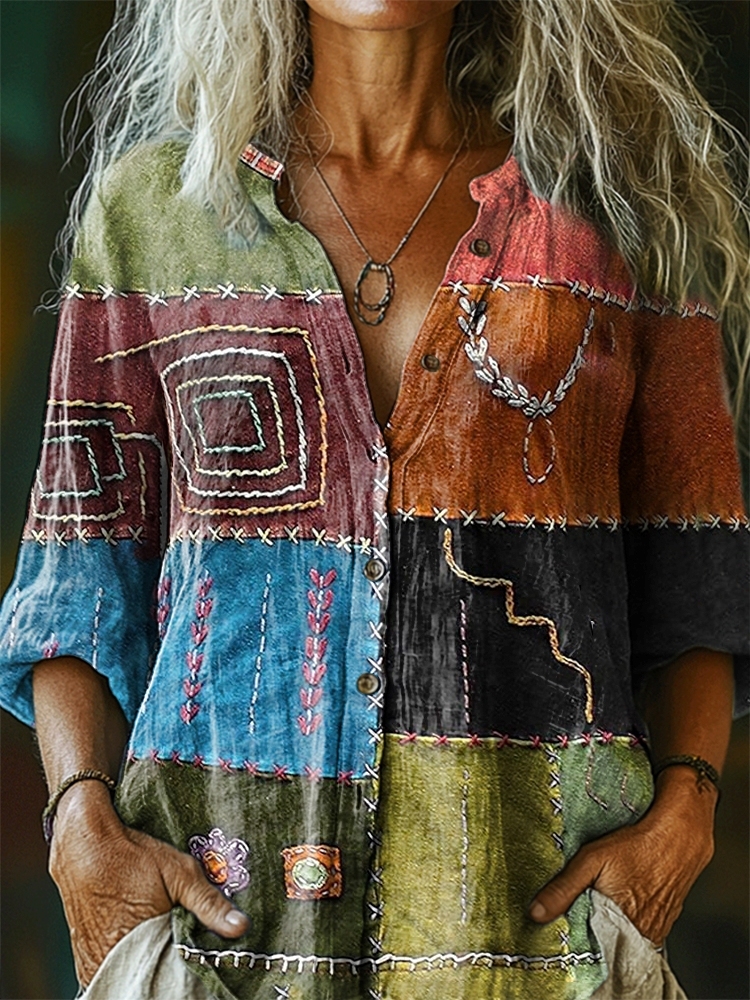 Women's Colorful Patchwork Pattern Art Print Casual Cotton Linen Shirt