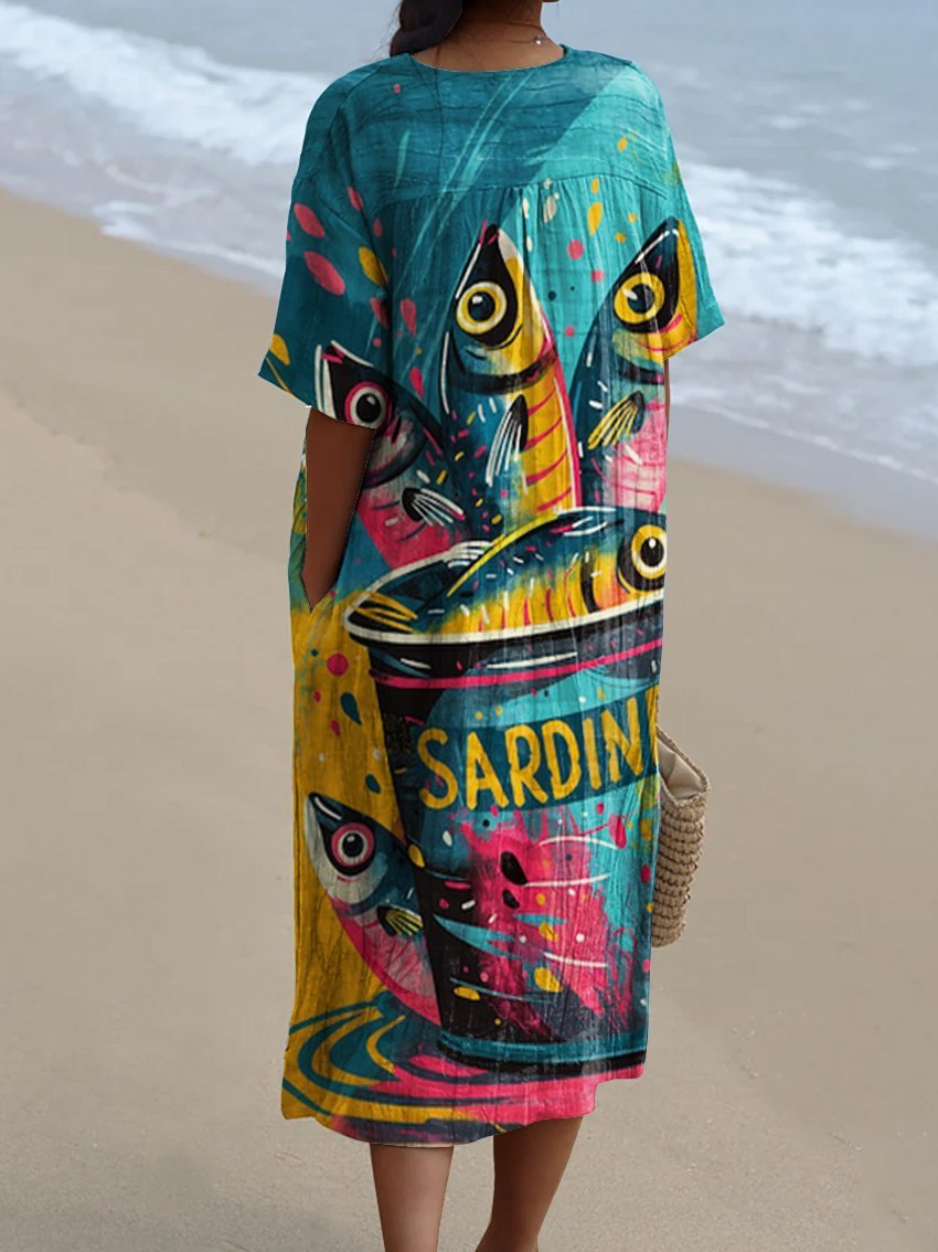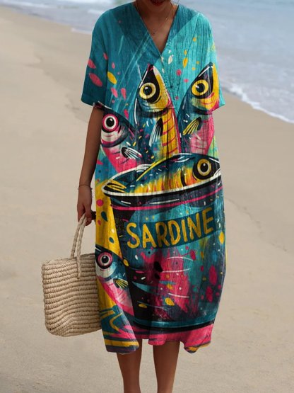 Women's Colorful Sardines Watercolor Splash Fluid Art Print Flowy Dress