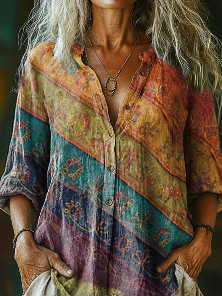 Women's Colorful Stripe Tattoo Pattern Art Print Casual Cotton Linen Shirt