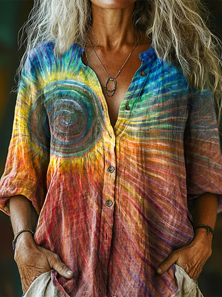 Women's Colorful Sun Art Print Casual Stand Collar Cotton and Linen Shirt