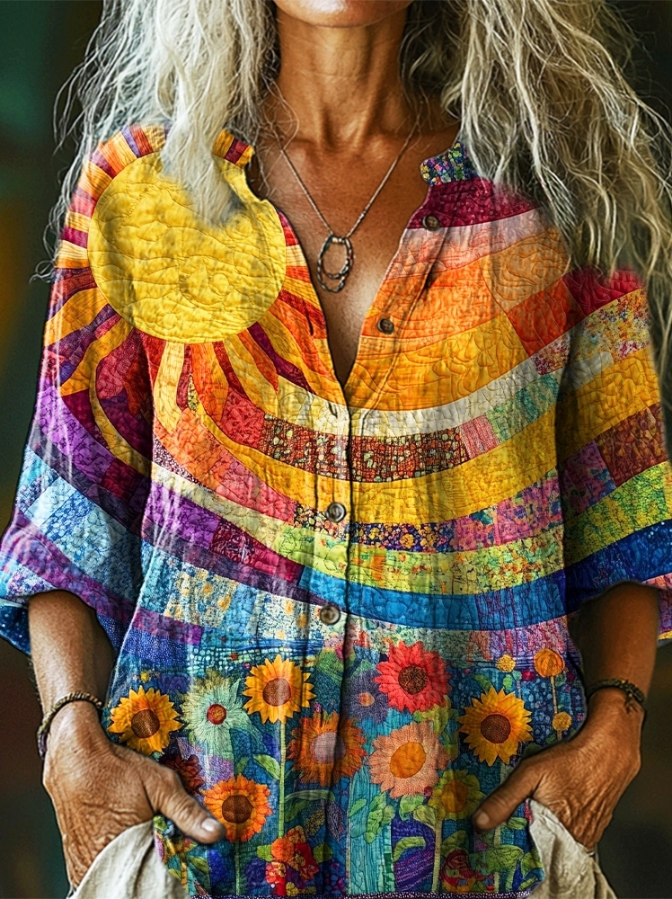 Women's Colorful Sun Floral Collage Art Print Casual Cotton Linen Shirt