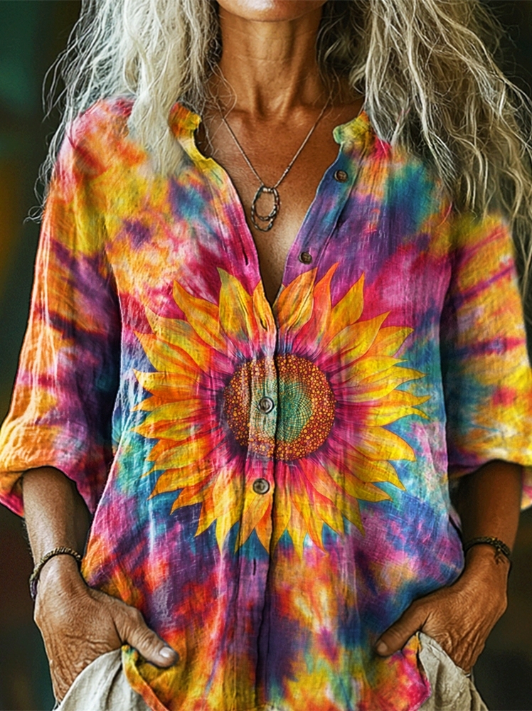 Women's Colorful Tie-dye Sunflower Art Print Casual Cotton Linen Shirt