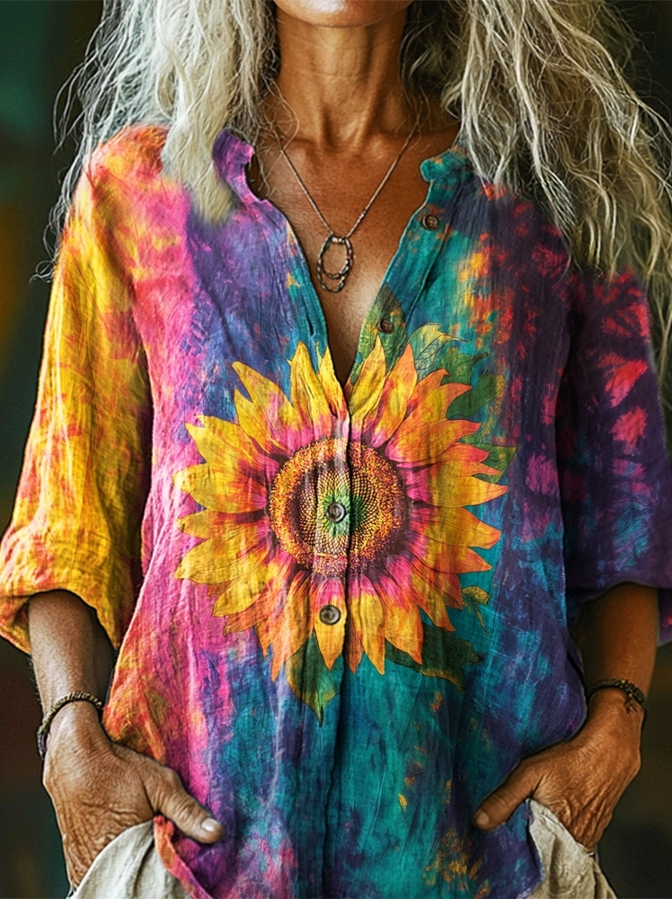 Women's Colorful Tie-dye Sunflower Art Print Casual Cotton Linen Shirt